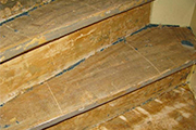 Schuur de plamuur met korrel 80. Controleer of er nog wat bij geplamuurd moet worden en schuur daarna met korrel 120 zowel de geplamuurde treden als de opstaande schopkanten.